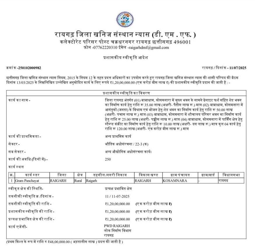 बाबा सत्यनारायण के जन्मदिन के ख़ास अवसर पर रायगढ़ विधायक और छत्तीसगढ़ सरकार में मंत्री ओपी चौधरी ने जिला खनिज न्यास मद DMF से एक करोड़ बीस लाख की राशि बाबा सत्यनारायण धाम परिसर कोसमनारा के चार अलग अलग विकास कार्यों के लिए जारी की है। इस राशि से मुख्य भवन के सामने 35 लाख की लागत से ग्रेनाईट फ़र्श कार्य और शेड निर्माण, बाबा सत्यनारायण धाम आने वाले लोगों के विश्राम और भोजन के लिए 50 लाख की लागत से शेड निर्माण, बाबा सत्यनारायण धाम परिसर में 25 लाख की लागत से शौचालय भवन निर्माण और बाबा सत्यनारायण धाम परिसर में 12 लाख की लागत से स्टैम्प्ड कांक्रीट पार्किंग निर्माण कार्य होना है, इन सभी निर्माण कार्यों के लिए PWD लोक निर्माण विभाग को एजेंसी बनाकर 250 दिनों में कार्य पूर्णता का लक्ष्य दिया गया है।
