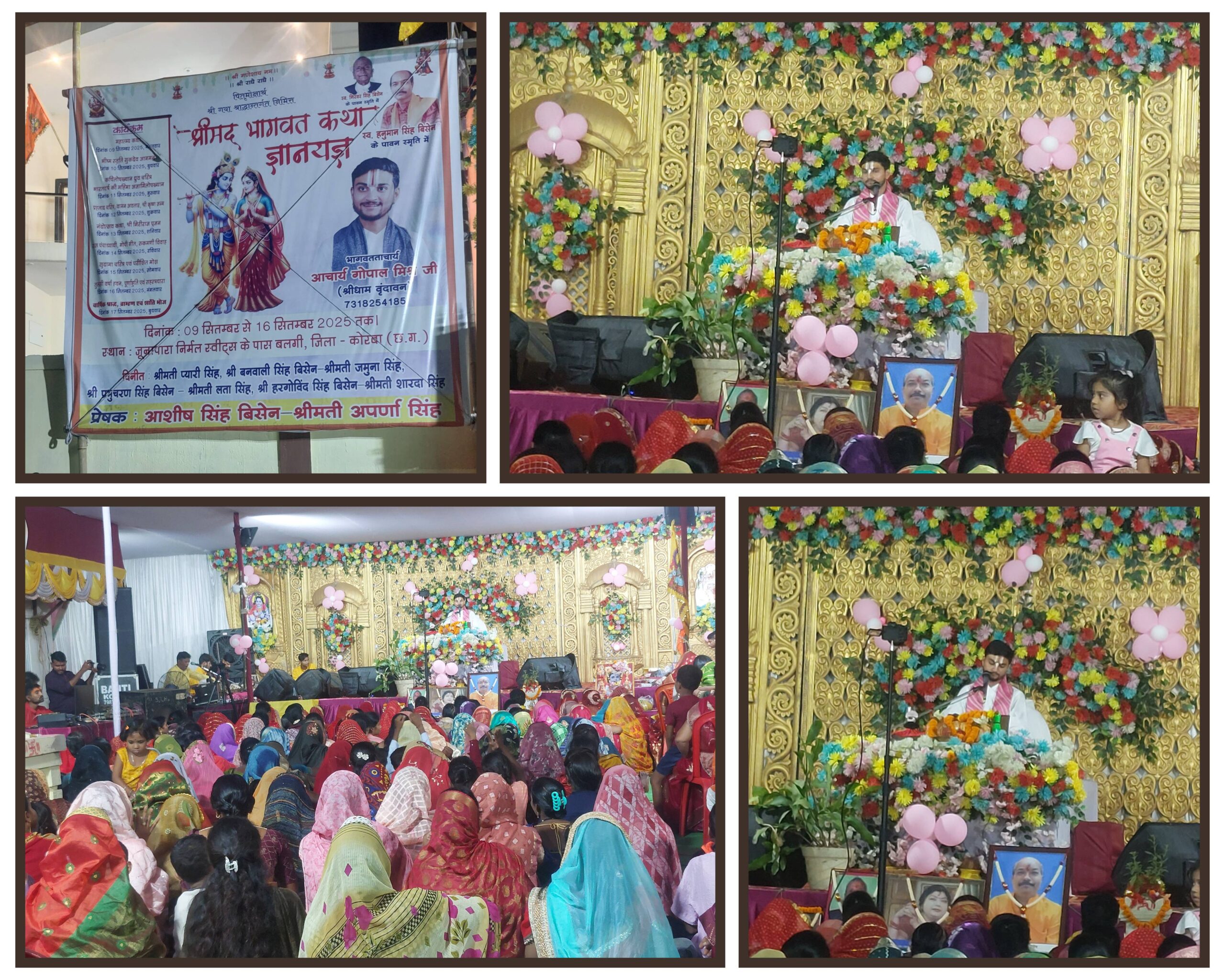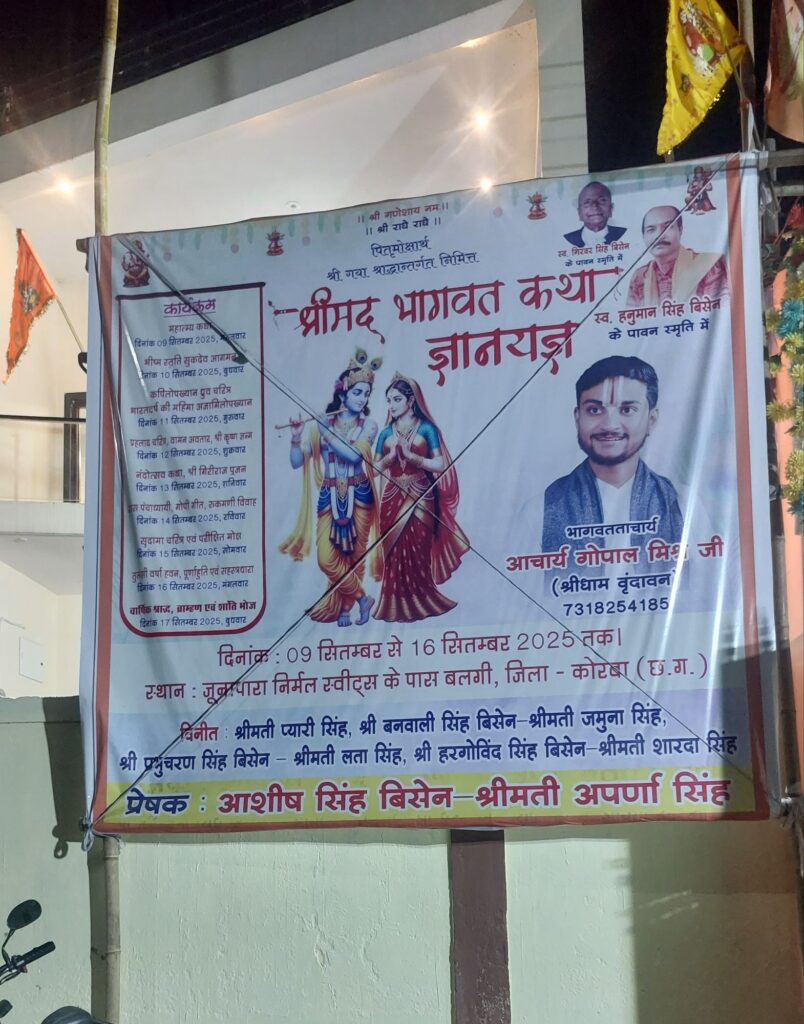कोरबा जिले अंतर्गत बलगी जूनापारा क्षेत्र के निर्मल स्वीट्स के बगल में बिसेन राजपूत परिवार द्वारा संगीतमय श्रीमद् भागवतकथा महायज्ञ का आयोजन बीते नौ सितंबर से किया गया, पहले दिन कथा महात्म्य हुआ, फिर अगले दिन से श्रीमद् भागवतकथा शुरू हुई, जो कि हर रोज़ दोपहर बाद से शुरू होकर देर शाम तक जारी रही, श्री वृंदावन धाम से पधारे देश के उभरते कथा व्यास आचार्य गोपाल मिश्र जी के श्री मुख से अविरल प्रवाहित होने वाली भागवत गंगा ने श्रोताओं को मंत्रमुग्ध कर रही है, श्रीमद् भागवतकथा के सभी प्रसंगों को विस्तार के साथ सरल और सहज अंदाज़ में श्रोताओं तक पहुंचाने का काम कथा-व्यास द्वारा व्यासपीठ से किया जा रहा है, श्रीमद् भागवतकथा के दौरान संगीत मंडली का भी एक अलग ही प्रभाव निकल कर आ रहा है, भजनों के माध्यम से भी श्रोताओं को श्रीमद् भागवतकथा से जोड़कर रखा जा रहा है, वहीं हर दिन कथा के कुछ ख़ास प्रसंगों में बिसेन परिवार की बहू बेटियों की कलात्मक सहभागिता से सजीव झांकियों का भी प्रदर्शन किया गया, जिससे कथा स्थल पर मौजूद तमाम धर्मपारायण श्रोता भाव विह्वल हो उठे। जिस दिन से श्रीमद् भागवतकथा की शुरुआत हुई है, उसी दिन से निर्धारित समय में बलगी सहित आसपास के क्षेत्र के श्रोताओं की मौजूदगी बिसेन परिवार के नवनिर्मित आवास परिसर में भव्यता के साथ तैयार किये गये कथा पंडाल में हो जाती है, श्रोताओं में महिलाओं की तादाद लगातार बढ़ती जा रही है, आयोजक बिसेन परिवार द्वारा कथा सुनने आने वाले भक्तों के लिए बैठने की पर्याप्त व्यवस्था की गई है, बिसेन परिवार द्वारा आयोजित श्रीमद् भगवत कथा की पूर्णाहुति सोलह सितंबर मंगलवार को होनी है, श्रीमद् भागवतकथा स्थल पर मौजूद सभी भक्तों में अपार श्रद्धा और समर्पण का भाव भी देखा जा रहा है। श्रीमद्भागवत कथा सप्ताह का विश्राम 16 सितंबर को पूर्णाहुति और भंडारा प्रसाद के साथ होना है, जिसके लिए बिसेन परिवार द्वारा भव्यता के साथ व्यवस्थाएं की गई हैं।