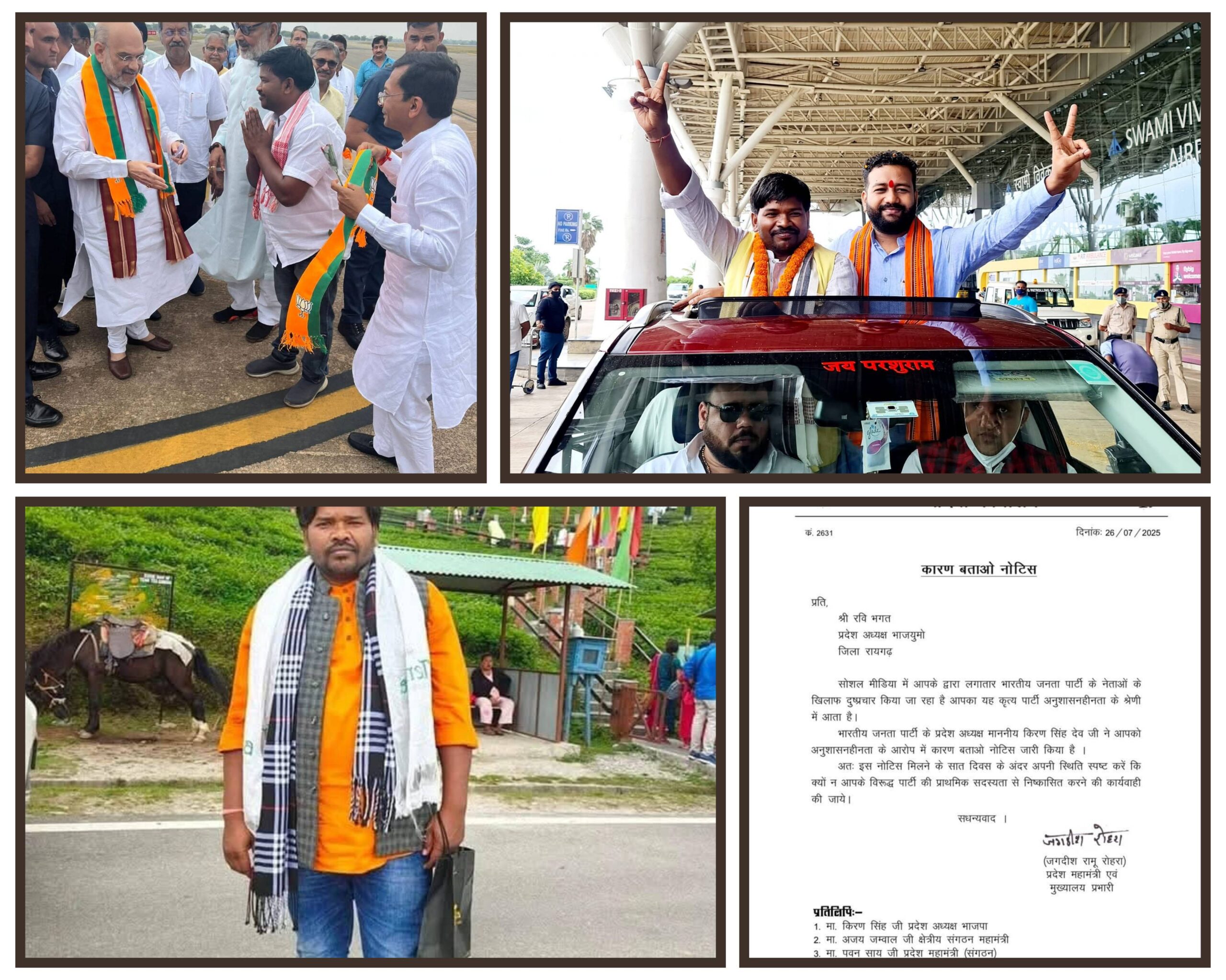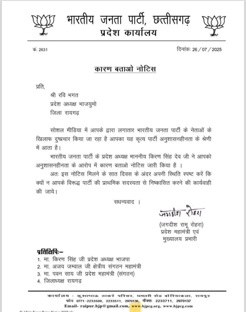 आख़िरकार भारतीय जनता युवा मोर्चा के प्रदेशाध्यक्ष रायगढ़ जिले के युवा आदिवासी नेता रवि भगत को बीजेपी के प्रदेश महामंत्री और छत्तीसगढ़ मुख्यालय प्रभारी जगदीश रोहरा का हस्ताक्षर किया हुआ कारण बताओ नोटिस आज 26 तारीख़ को भेज दिया गया है, इस नोटिस में भाजपा प्रदेश मुख्यालय की तरफ़ से साफ़ कहा गया है कि सोशल मीडिया के जरिए भाजपा नेताओं के ख़िलाफ़ लगातार दुष्प्रचार किया जा रहा है, जो कि पार्टी की अनुशासनहीनता के दायरे में आता है, नोटिस में जवाब प्रस्तुत करने के लिए रवि भगत को सात दिनों की समय सीमा दी गई है, अगर तय समय सीमा में संतोषजनक जवाब नहीं आता तो भाजयुमो प्रदेश अध्यक्ष रवि भगत के ख़िलाफ़ पार्टी की प्राथमिक सदस्यता से निष्कासन की कार्रवाई भी की जा सकती है। रवि भगत के ख़िलाफ़ कारण बताओ नोटिस जारी करके भारतीय जनता पार्टी की छत्तीसगढ़ इकाई ने साफ़ मैसेज दे दिया है कि पार्टी लाईन के ख़िलाफ़ जो भी जायेगा, उसको ऐसी कार्रवाई का सामना करना ही पड़ेगा, भले उसके पास बड़ा पोर्टफोलियो ही क्यों ना हो?